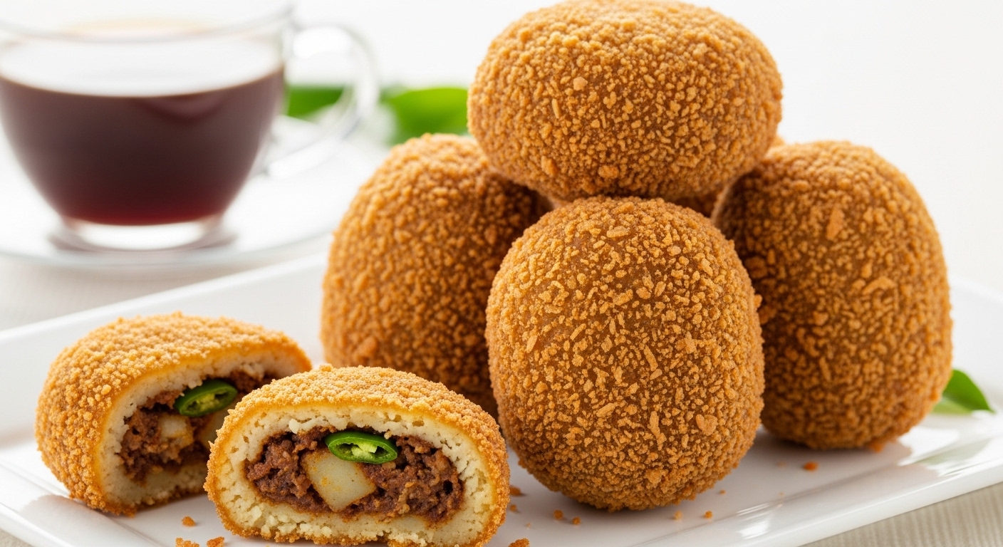 Dip each ball into the beaten egg, coat evenly with breadcrumbs, and deep fry until dark golden brown.
