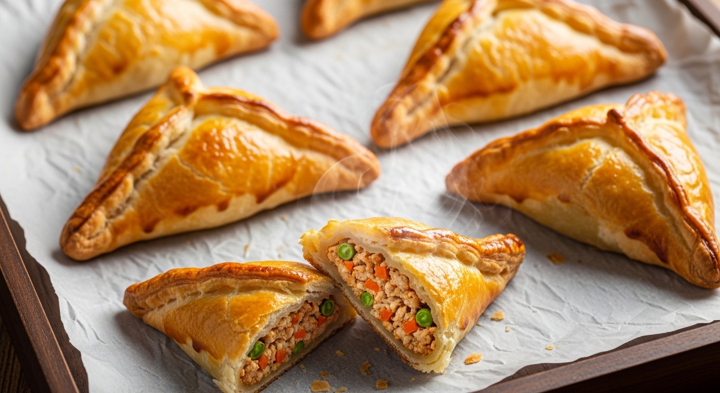 Brush the tops with egg wash and bake at 200°C for 15-20 minutes until the pastry is puffed, flaky, and golden.